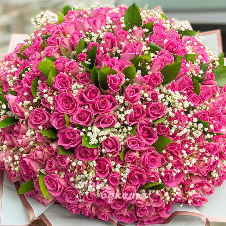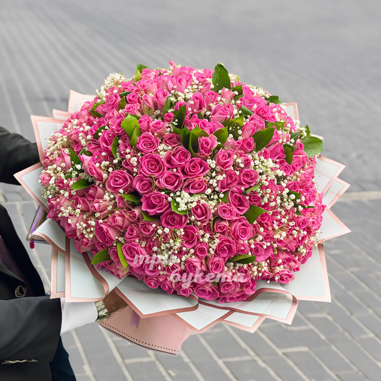 Букет из 251 розовой розы с гипсофилой