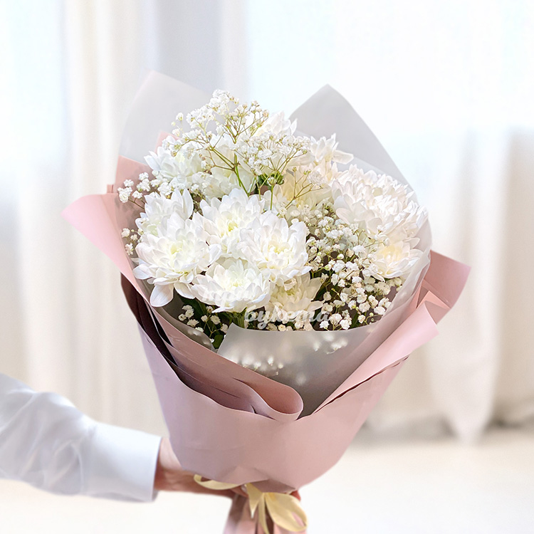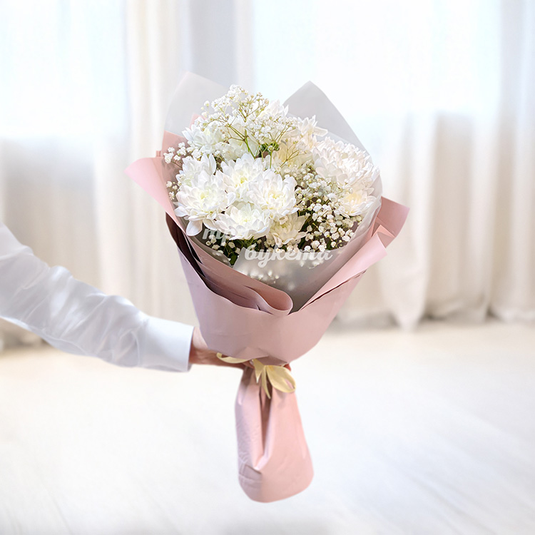 Букет из белых хризантем с гипсофилой