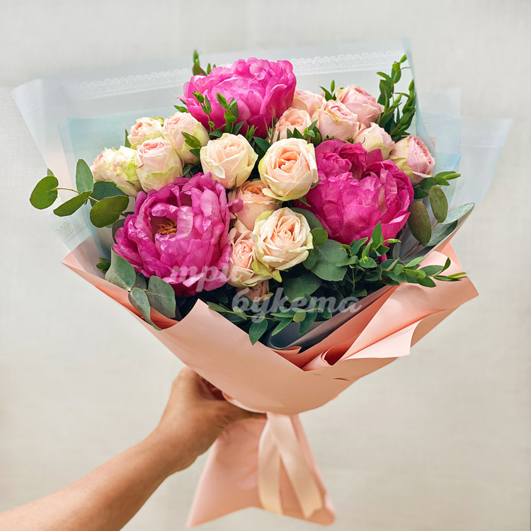 Букет розовых пионов и персиковых роз