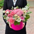 Коробка белых и персиковых гвоздик и роз