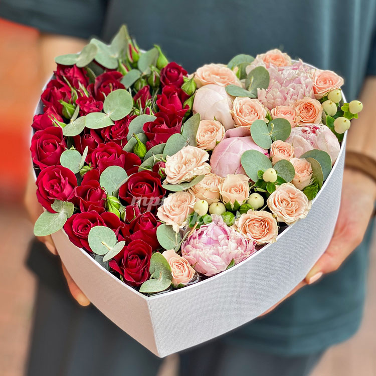 Коробка-сердце с куст. розами и пионами