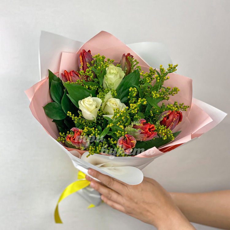 Красные тюльпаны и белые розы