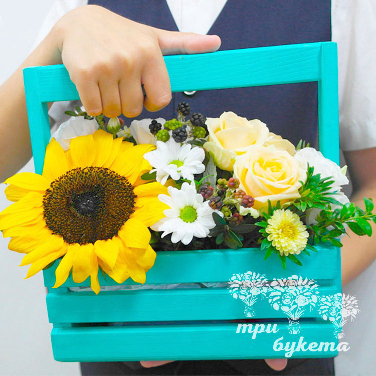 Подсолнух и розы учителю в ящичке
