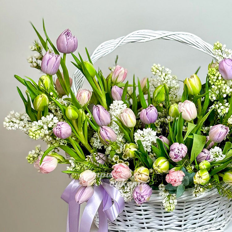 Пышная корзина с тюльпанами и сиренью